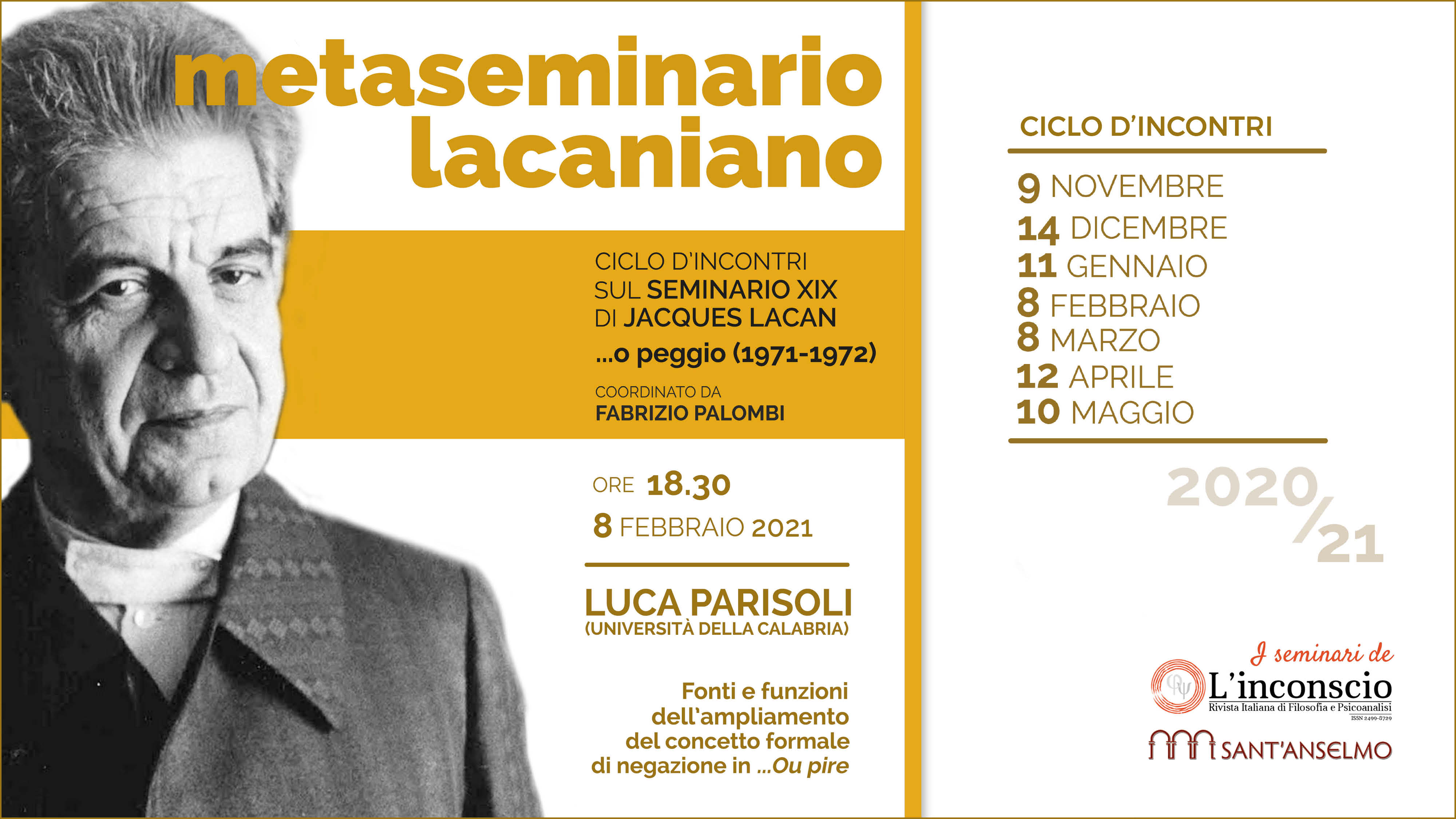 On Monday 8 February 2021, at 6.30 p.m., the IV meeting of the "Metaseminario lacaniano" will be held. Prof. Luca Parisoli(Professor of History of Medieval Philosophy at the University of Calabria) will present “Fonti e funzioni dell'ampliamento del concetto formale di negazione in ... Ou pire”. The meeting will be coordinated by prof. Fabrizio Palombi (second-level professor of Theoretical Philosophy at the University of Calabria). As in previous times, the event will be broadcast live on the Metaseminario lacaniano Facebook group; participation is free upon registration to the group.