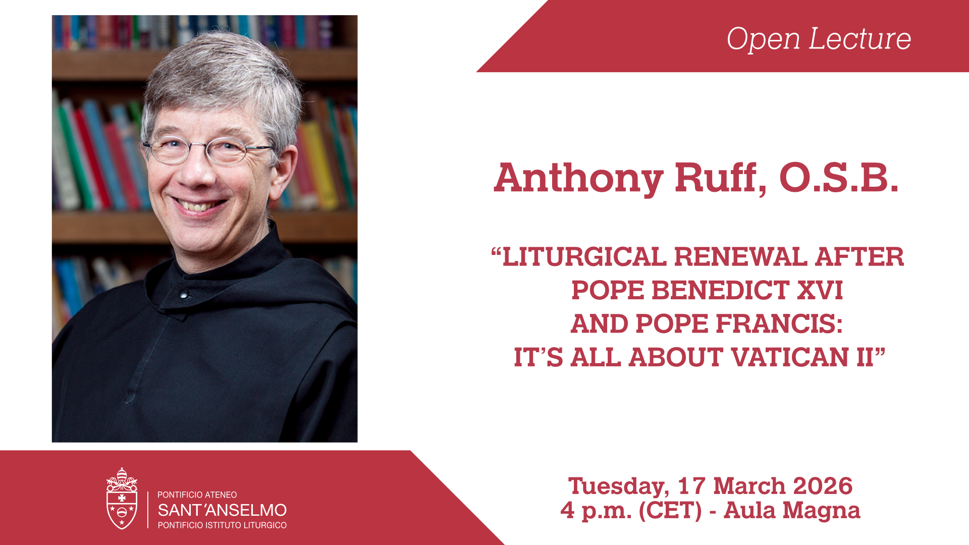 Tuesday, 17 March 2026 - 4 p.m. (CET): The Pontifical Liturgical Institute cordially invites faculty, students, and the general public to a special Open Lecture given by Prof. Dr. Anthony Ruff, O.S.B., entitled