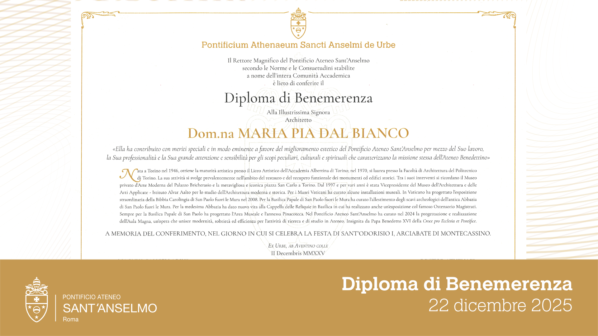 22 dicembre 2025. Il Rettore Magnifico Prof. Jákó Örs Fehérváry, O.S.B., secondo le norme stabilite, dopo aver consultato il suo Consiglio e il Gran Cancelliere, con apposito Decreto (Prot. 00287/25/RM) ha insignito l’Architetto D.na Maria Dal Bianco di Torino dell’onorificenza denominata Benemerenza del Pontificio Ateneo Sant’Anselmo.